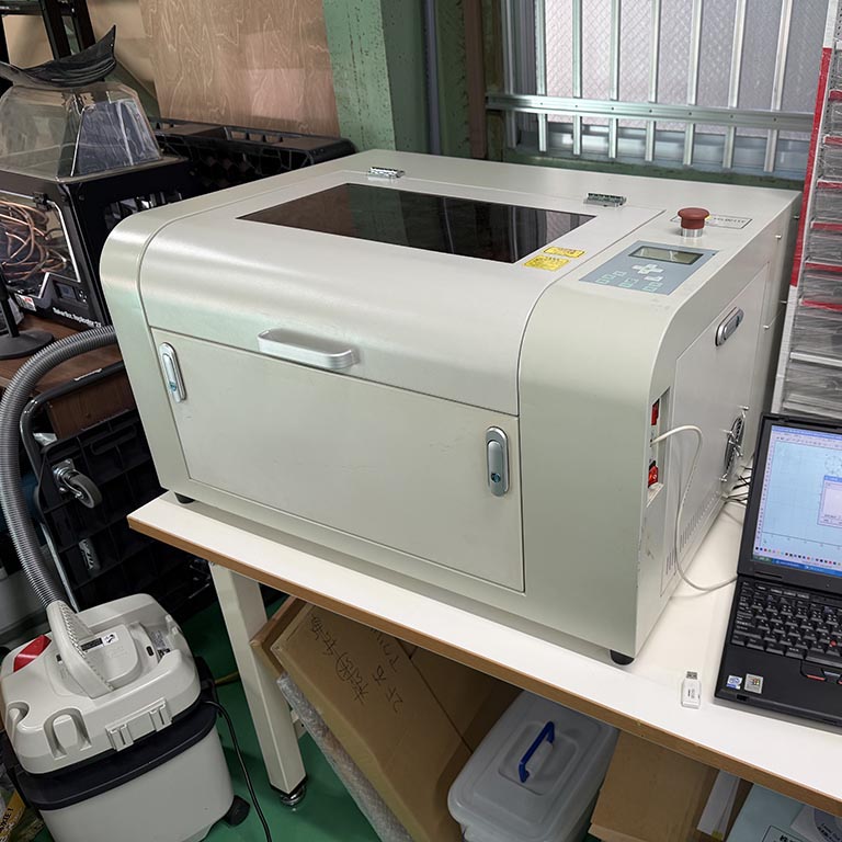 40W CO2レーザー。数ミリ厚までのMDFやアクリル板をレーザーで切削加工することができます。